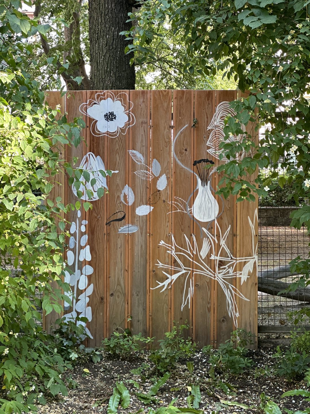 Wildrose und Aconitum, Acryl auf einem Element des ehemaligem Gartenzauns, 170 x 140 cm, Ausstellungsansicht Flora, wett, Basel, 2023